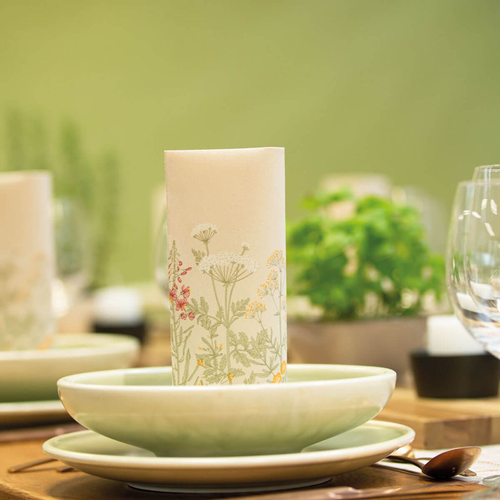 Die neuen naturverbundenen Designs ALEA, AURELIA und BENTE kennzeichnen unseren aktuellen Servietten-Look für 2022. Die Serviette AURELIA ist aus hochwertigem Mank-Linclass hergestellt. Linclass-Servietten sind angenehm weich und lassen sich sehr gut falten.